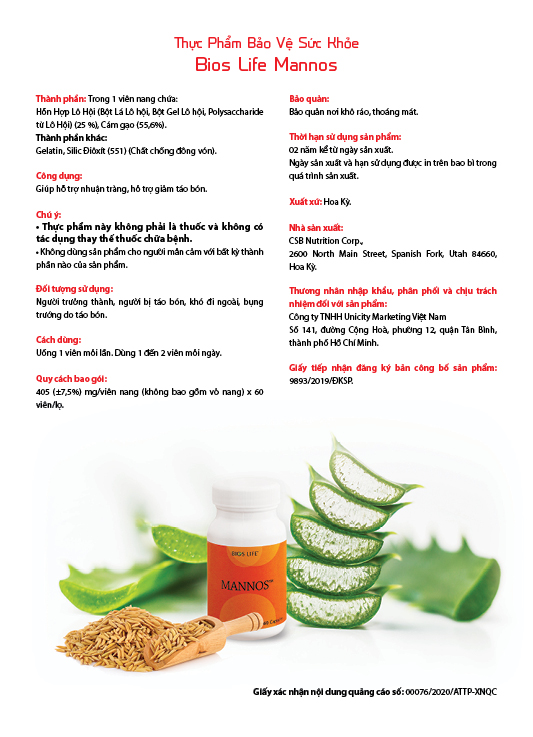 Sản phẩm Unicity Bios Life Mannos là sản phẩm giúp tăng cường hệ miễn dịch cho cơ thể . Sản phẩm được sản xuất từ cây lô hội với nhiều nguồn dinh dưỡng cao nhằm thúc đẩy hệ thống miễn dịch gia tăng sản xuất ra các cytokine , qua đó nó giúp các tế bào miễn dịch khác chống lại bệnh tật gây ra bởi các virus, vi khuẩn, và ký sinh trùng.