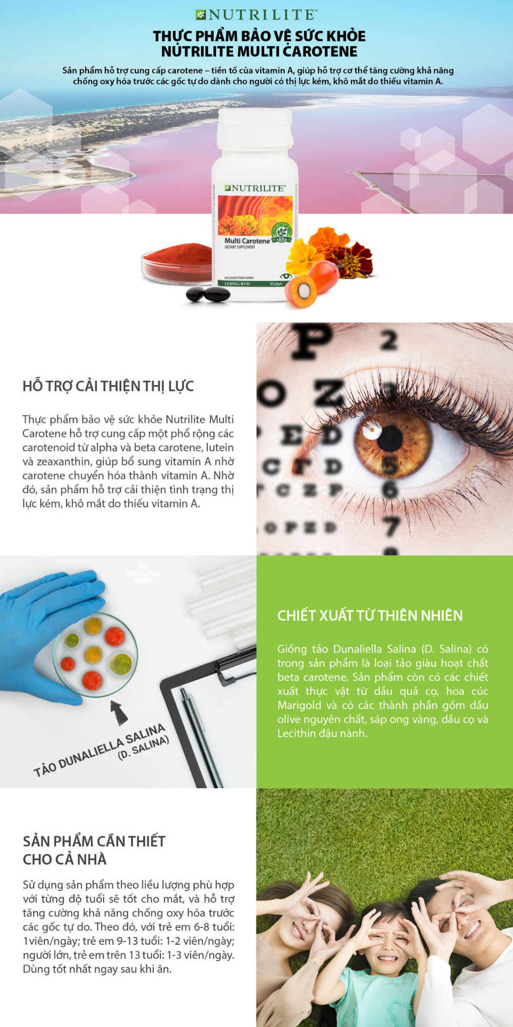 Hỗn hợp Carotene tự nhiên từ 3 loại chiết xuất thực vật: vi tảo Dunaliella Salina, dầu quả cọ và hoa cúc Marigold, cung cấp một phổ rộng các carotenoid từ alpha và beta carotene, lutein và zeaxanthin, giúp bổ sung vitamin A nhờ carotene chuyển hóa thành vitamin A theo nhu cầu của cơ thể.