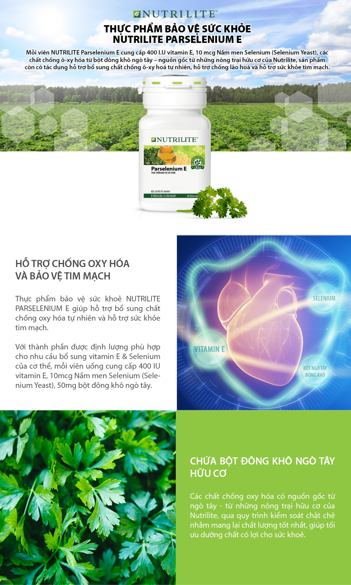 Thông tin dinh dưỡng: Mỗi viên NUTRILITE Parselenium E cung cấp 400 IU vitamin E, 10mcg Nấm men Selenium (Selenium Yeast), 50mg bột đông khô ngò tây, có tác dụng hỗ trợ bổ sung chất chống ô-xy hóa tự nhiên, hỗ trợ chống lão hóa và hỗ trợ sức khỏe tim mạch.